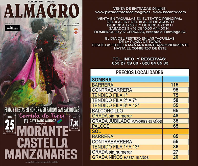 La Casa Matilla mantiene los precios de la temporada pasada. Las localidades para esta corrida de toros, pueden adquirirlas a partir de mañana lunes 11 de agosto en la taquilla física que como viene siendo habitual, la empresa habilita en el Teatro Principal, sito en la calle San Agustín nº20 de Almagro, en horario de 10,30 a 13,30 horas y de 18,30 a 21 horas. La taquilla permanecerá abierta los días del 11 al 16 y del 18 al 23 de agosto. El día del festejo se abrirán las taquillas de la plaza de toros. Además para los aficionados que lo deseen también pueden adquirir las entradas en la web de la empresa www.funtausa.com. Por otro lado, existen dos teléfonos de reservas que son el 620.048.583 y el 653.275.903.