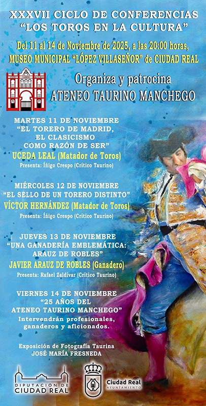 El viernes 14 concluirá este ciclo que alcanza las treinta y siete ediciones, con un acto donde intervendrán profesionales, ganaderos y aficionados bajo el titulo “25 años del Ateneo Taurino Manchego”