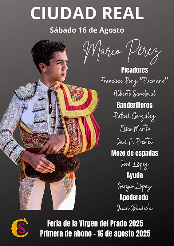 Marco Pérez supone la gran esperanza de los toreros jóvenes en la actualidad. Recién tomada su alternativa en Nimes el pasado mes de junio de manos de Morante de la Puebla como padrino y Talavante como testigo, el joven salmantino llega a Ciudad Real arrollando con sus triunfos.