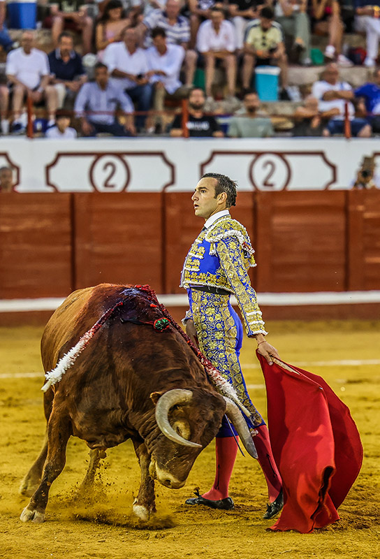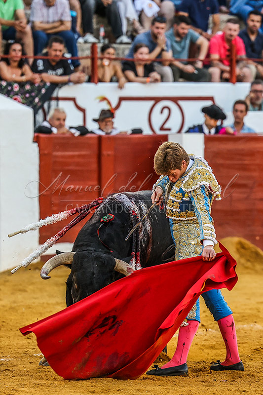 El quinto de la tarde quizás el mejor toro de la corrida, el que tuvo más lucimiento, Borja Jiménez lo bordó con el capote y muleta no dejándose nada dentro. En una faena que tuvo introducción, nudo y desenlace. Lo recibió con largas cambiadas de rodillas y se gustó por chicuelinas. Con la muleta lo toreo muy templado, muy puro de muñeca y con una gran carga emocional. El de Espartinas no necesita forzar gestos para conectar: lo hace desde la verdad, la serenidad y la entrega en una faena que revoluciono y jaleó el tendido premiándole con los máximos trofeos tras una certera estocada.