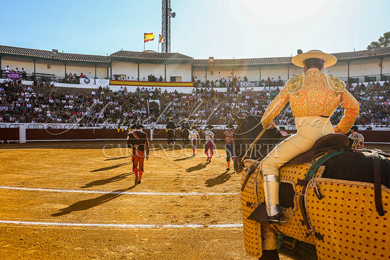 Con el toro que cerró la corrida, premiado con la vuelta al ruedo, si pudo Molina desquitarse con un toreo enrazado, con largas cambiadas de rodillas y con pases cambiados de hinojos con dominio en los terrenos de cercanías, pasándose a éste por inverosímiles huecos ya cuando al toro le costaba repetir en sus buenas y nobles embestidas. Con las manoletinas quietas se extrajo el albaceteño de cualquier impostura, para torear con la naturalidad precisa que da un pecho y cintura sin rigidez alguna. El toreo al natural fue una delicia, con dos series de mano baja, rotundo desde el embroque. Esta vez el acero si viajó a lo alto, lo que le valió el corte de dos orejas que le sirvieron para acompañar a David Galván, Borja Jiménez y al mayoral de la ganadería por la Puerta Grande.