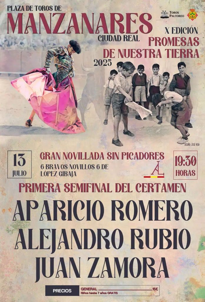Mañana será el turno para la primera semifinal del Certamen Promesas de Nuestra Tierra donde finalmente ha entrado uno de los novilleros de la provincia de Ciudad Real, Aparicio Romero, que actuará por tercera vez en una semifinal de este certamen y trenzará el paseíllo junto a Alejandro Rubio y Juan Zamora, que lidiarán una novillada de López Gibaja.