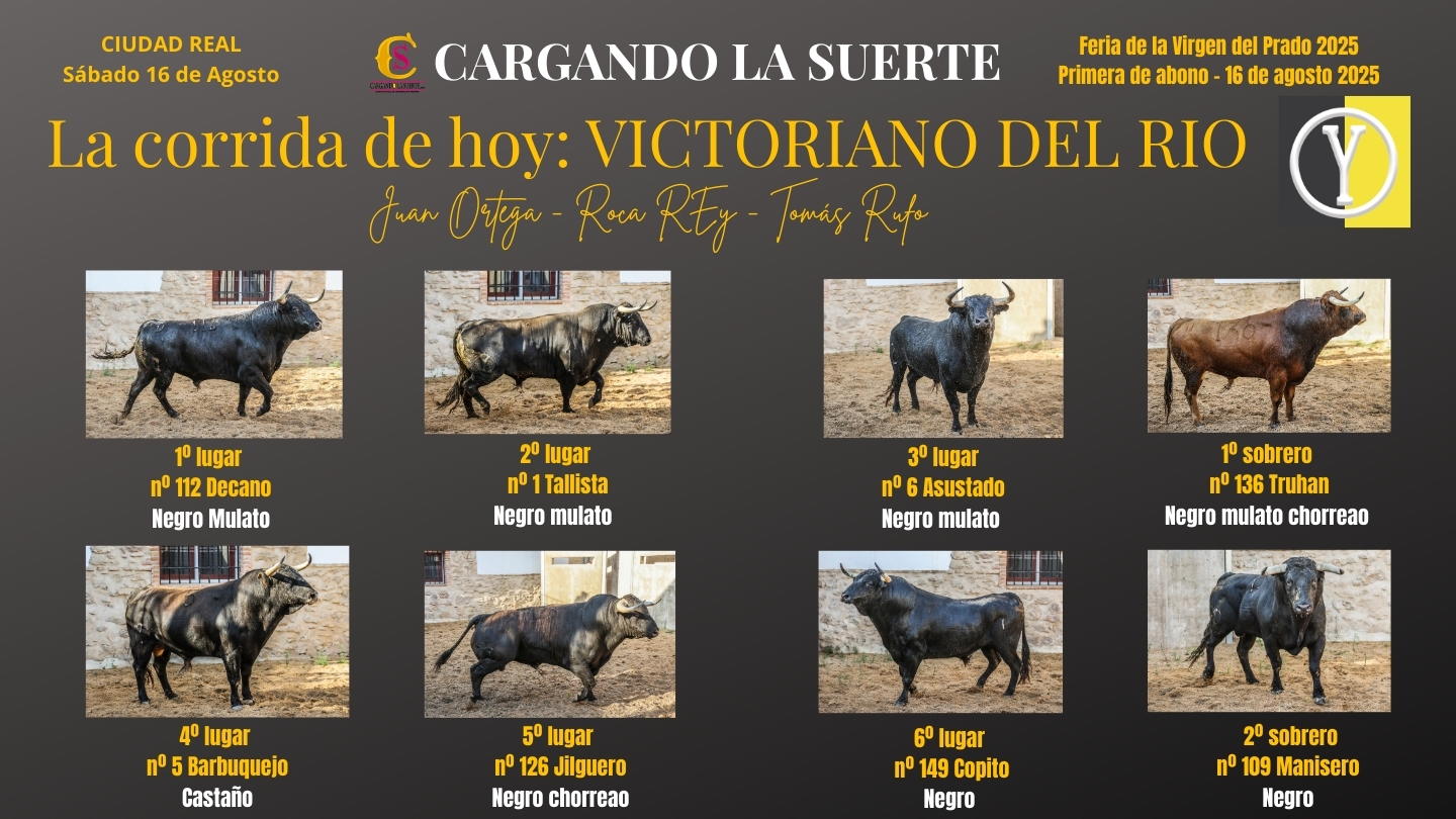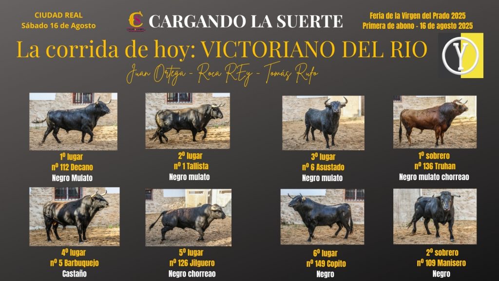 Este es el orden de lidia de los toros de Victoriano del Río para esta tarde.