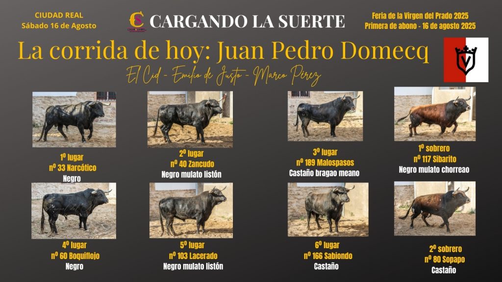 Este es el orden de lidia de los toros de Juan Pedro Domecq para esta tarde.