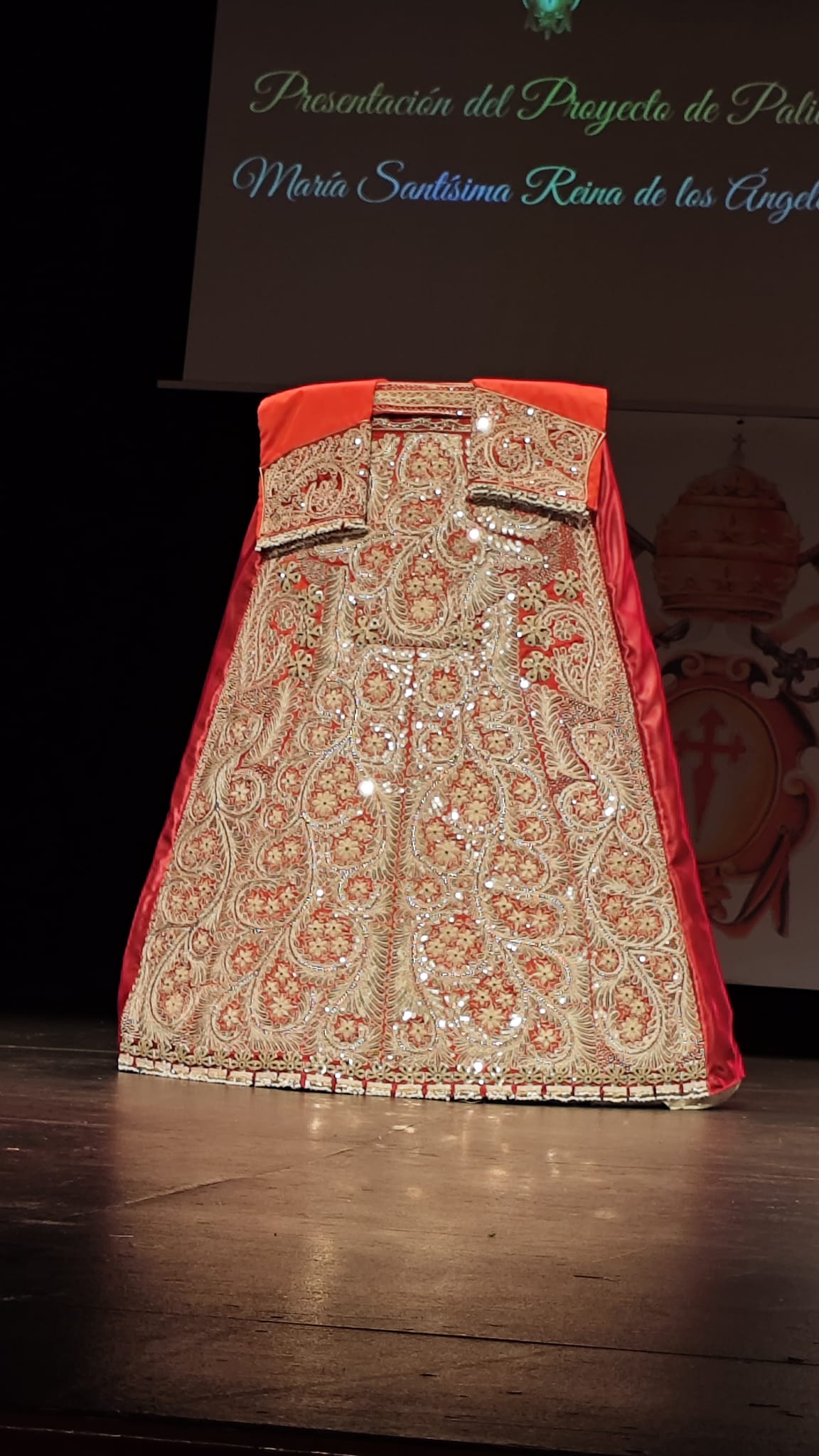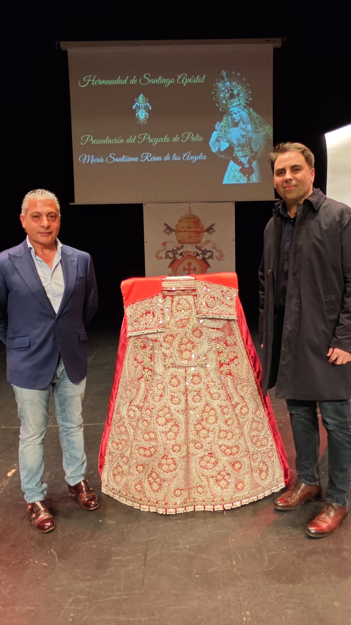 La Hermandad de Santiago Apóstol de Almagro celebró un acto este viernes en el Teatro Municipal para presentar el proyecto de palio de María Santísima Reina de los Ángeles, Titular de la cofradía. Pero este acto también sirvió para mostrar por primera vez una preciosa saya confeccionada por Sastrería Santos con el vestido grana y plata donado a la hermandad por el banderillero Jorge Fuentes, y que servirá para vestir la talla de esta Virgen almagreña.