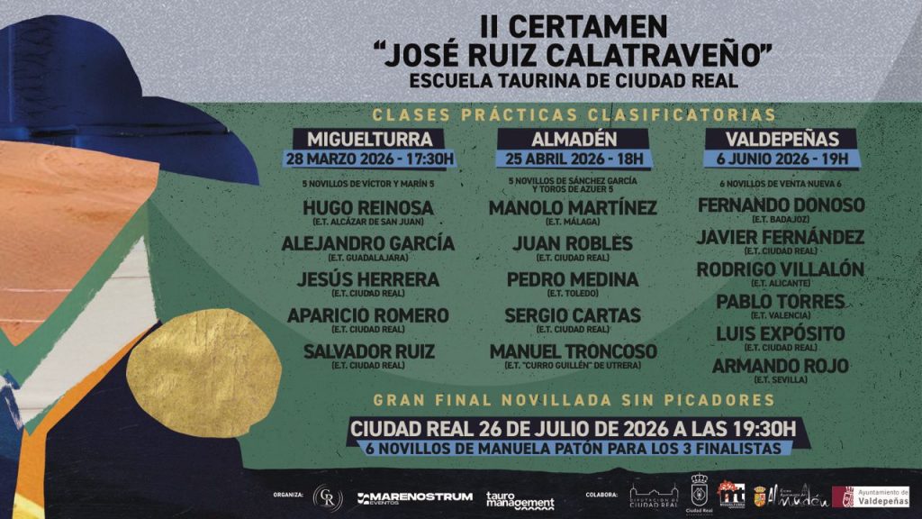 El certamen culminará con la gran final, una novillada sin picadores que se celebrará en Ciudad Real el 26 de julio de 2026 a las 19:30 horas, en la que se lidiarán seis novillos de la ganadería Manuela Patón para los tres finalistas que resulten seleccionados tras las clases prácticas clasificatorias.