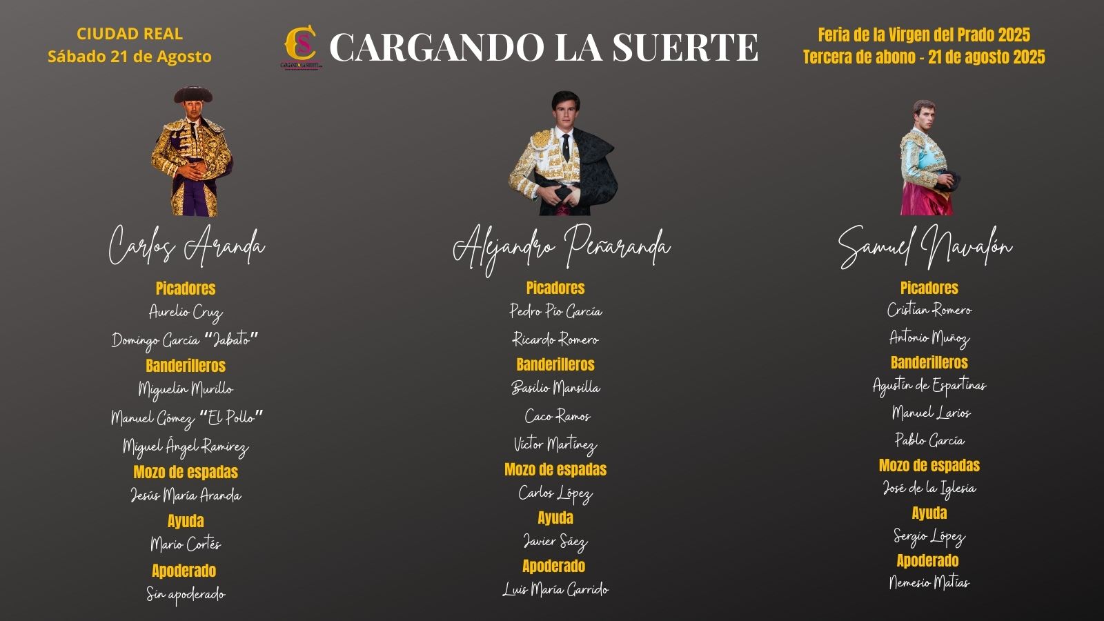 Llega Carlos Aranda “con la hierba en la boca” y se las verá con dos gallos que vienen arreando fuerte, Alejandro Peñaranda y Samuel Navalón. Se enfrentan ante astados de Martin Lorca.