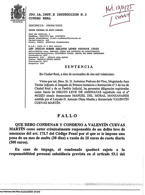 Los hechos se produjeron el pasado mes de junio, cuando el director de este medio se encontraba almorzando en compañía de otra persona en un conocido establecimiento de la capital. En ese momento apareció el Sr. Cuevas que sin mediar palabra se dirigió a Manuel del Moral con amenazas, como así lo prueba la sentencia ya firme.